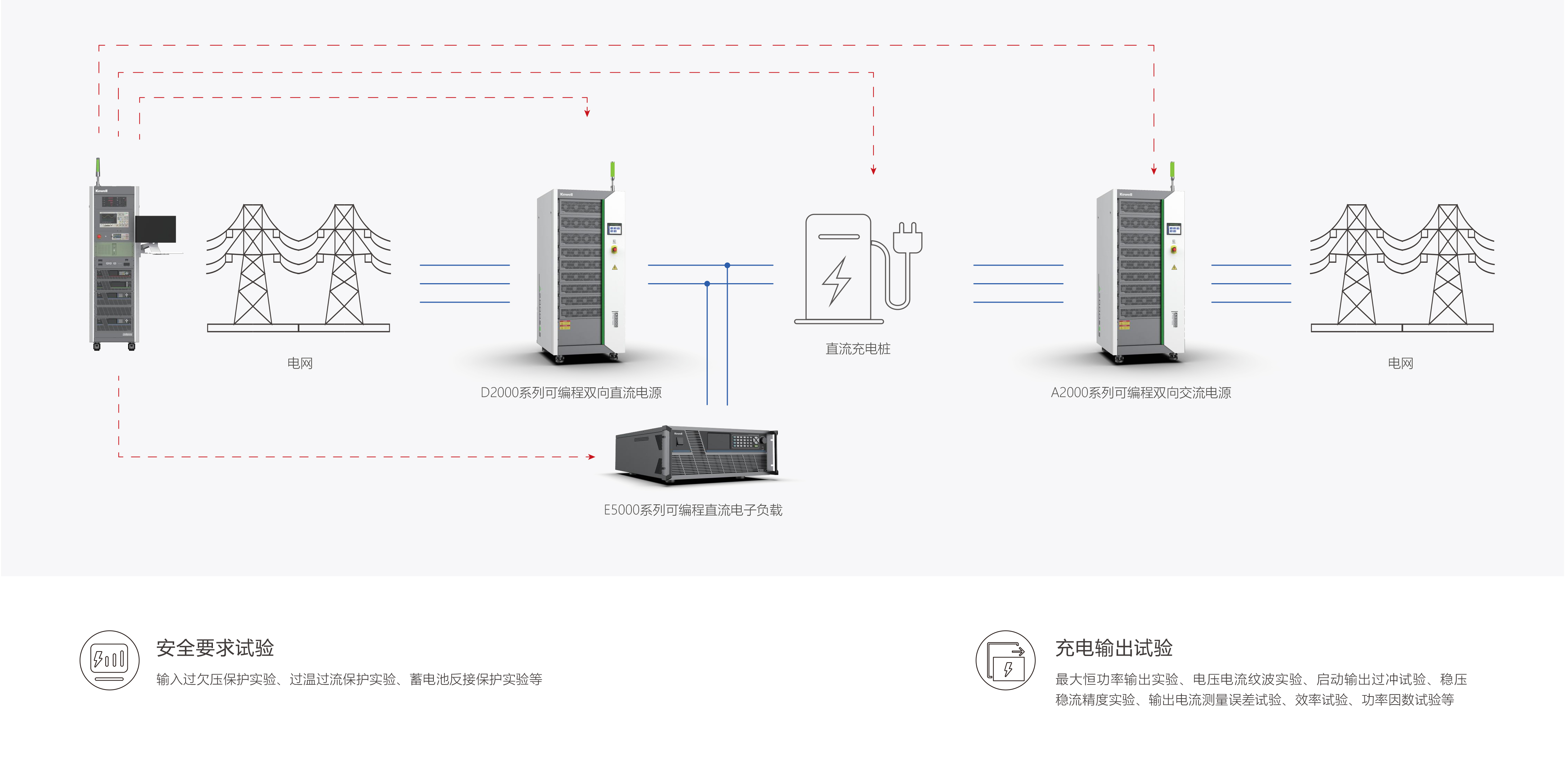 以相应国标为测试依据,采用自主开发的系统测试软件实现对充电桩的电性能、互操作性以及协议一致性的测试。适用于直流充电桩的研发、品质和认证测试。
