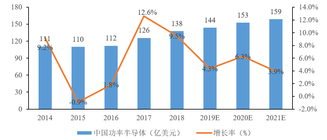 根据 IHS Markit 预测, 2021 年市场规模将增长至 441 亿美元,2018 年至 2021 年的年化增速为 4.09%,2018 年工业应用市场占全球功率半导体市场的 35.08%,汽车领域占比 23.55%,其次为通讯和消费电子领域。随着对节能减排的需求日益迫切,功率半导体的应用领域正在从传统的工业领域和 4C 领域逐步进入新能源、智能电网、轨道交通、变频家电等市场。