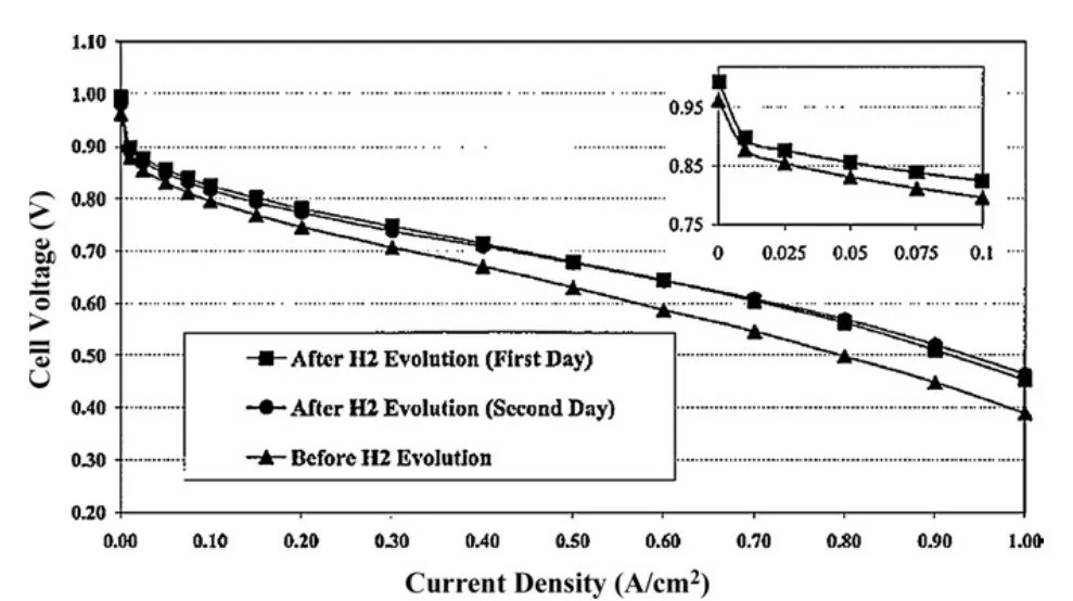 图3:多次阴极析氢过程后燃料电池性能对比