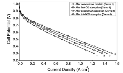 一氧化碳(CO)会强烈吸附在催化剂上严重污染PEM燃料电池,但也可利用此现象活化PEM燃料电池。图3比较了常规活化和CO氧化剥离条件下的性能。可以看出,在每个CO氧化剥离过程之后电池性能提高,通过三个CO吸附/ CO2解吸附循环活化比传统的活化程序所获得的性能高约29%。